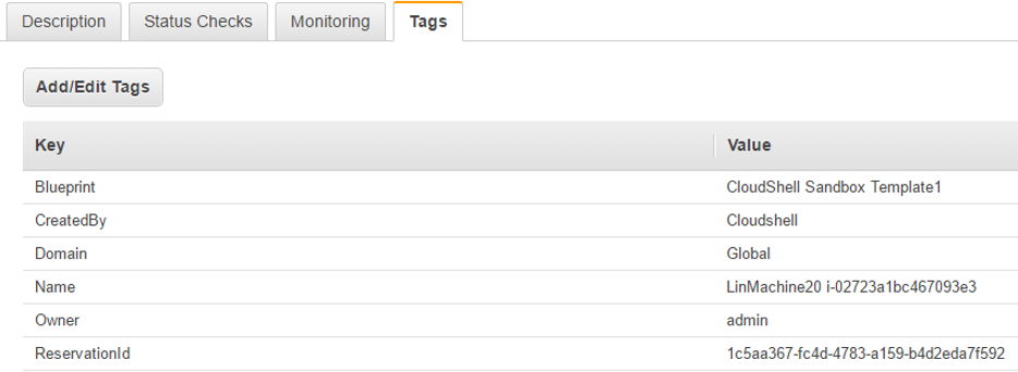 To assist with your AWS EC2 cost management activities, AWS EC2 resources that are created by CloudShell Apps include the following tags: Blueprint, CreatedBy, Domain, Name, Owner, and ReservationId.