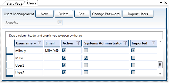 In Resource Manager Client, in the Users tab, imported users have the Imported check box selected (illustrated for user "Mika-y" in the image below).