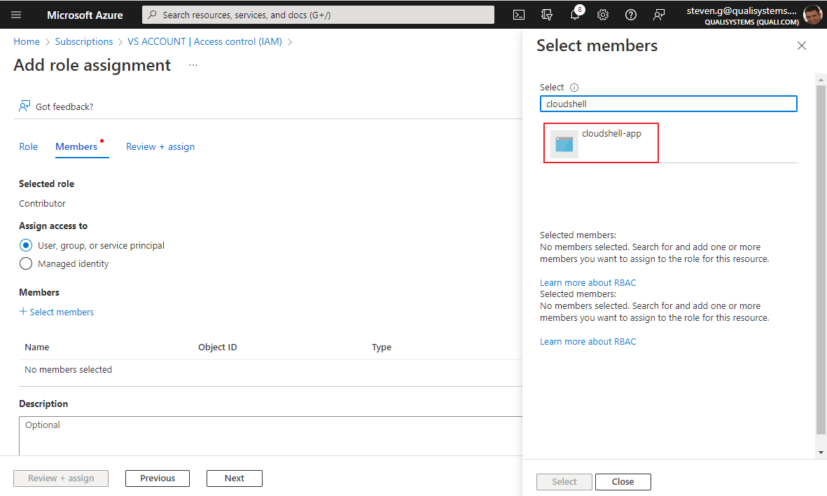4. In the Add role assignment blade, in the Role tab, select the Contributor role.