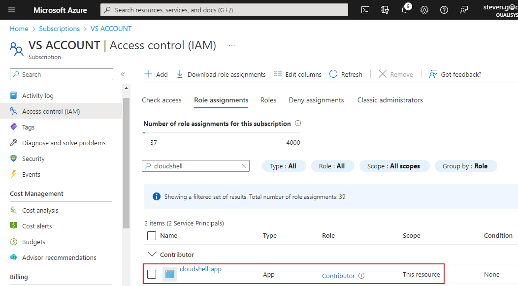 The Contributor role enables CloudShell to create and manage virtual machines and other Azure services.