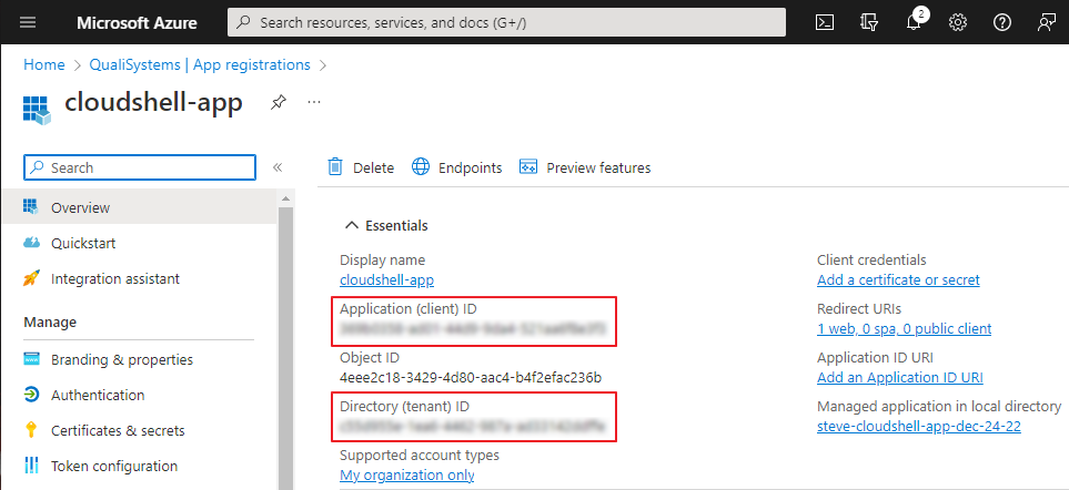 10. Copy and store the Application (client) ID and Directory (tenant) ID. You will need these values when creating the cloud provider resource in CloudShell.