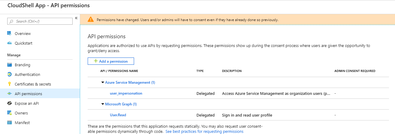 3. Make sure the Grant admin consent for <your company> link is checked next to the Add a permission button.