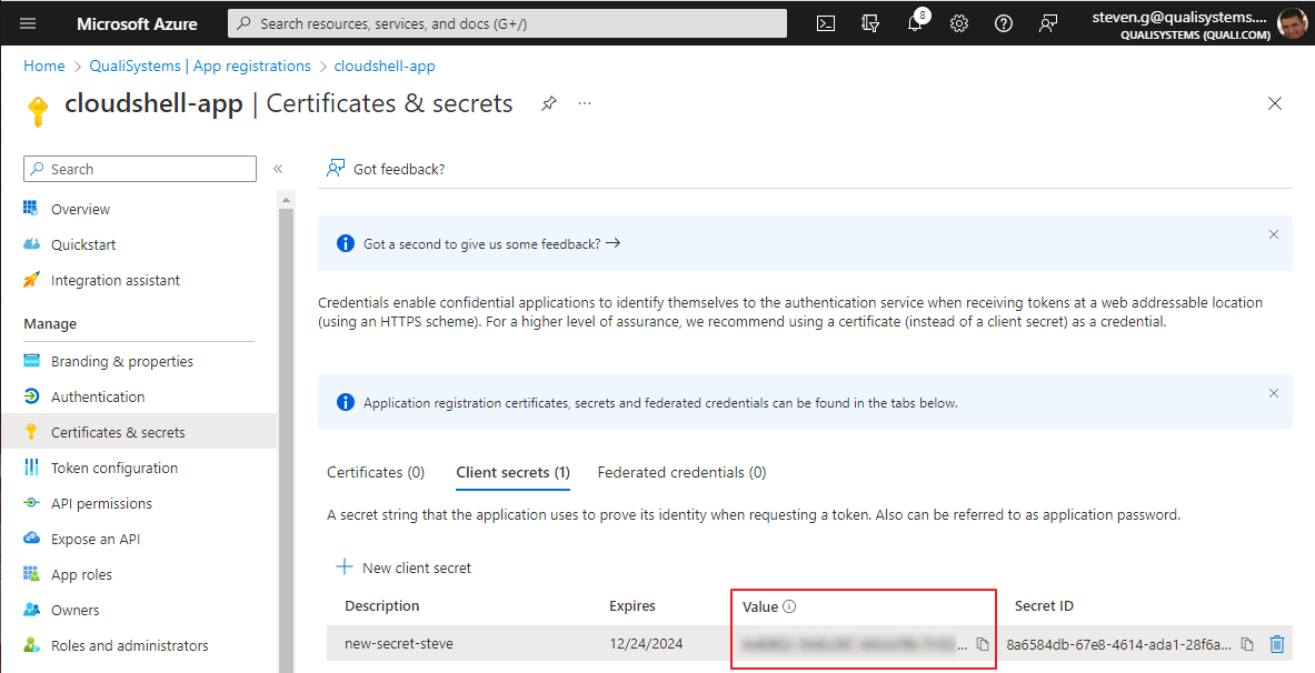 4. Next, create a client secret (Azure application) key to be used by the CloudShell App for authentication with Azure.