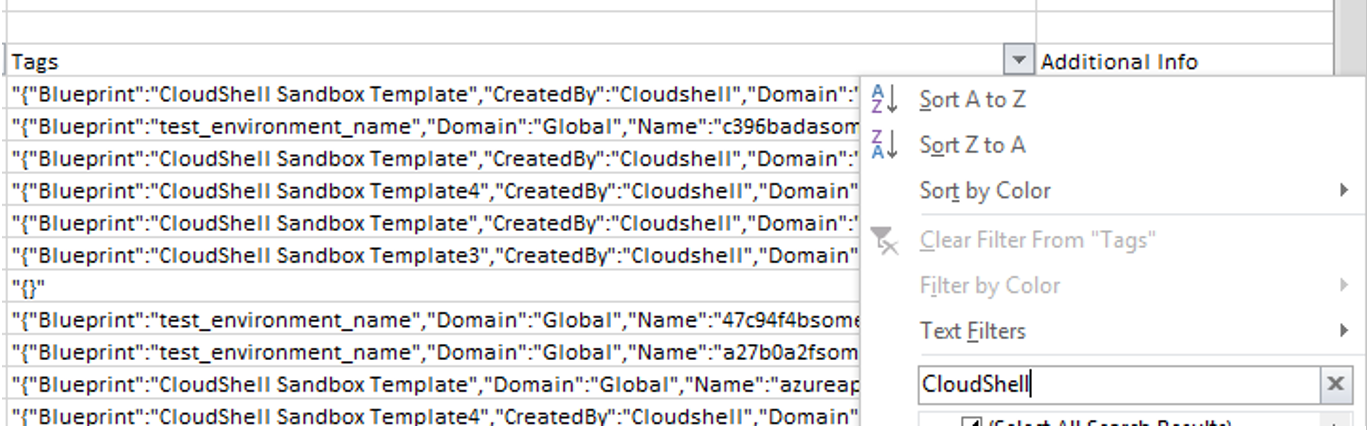 To assist with your Microsoft Azure cost management activities, Microsoft Azure resources, such as subnets, virtual machines and VNets, which are created by CloudShell Apps include the following tags: Blueprint, CreatedBy, Domain, Name, Owner, and SandboxId.