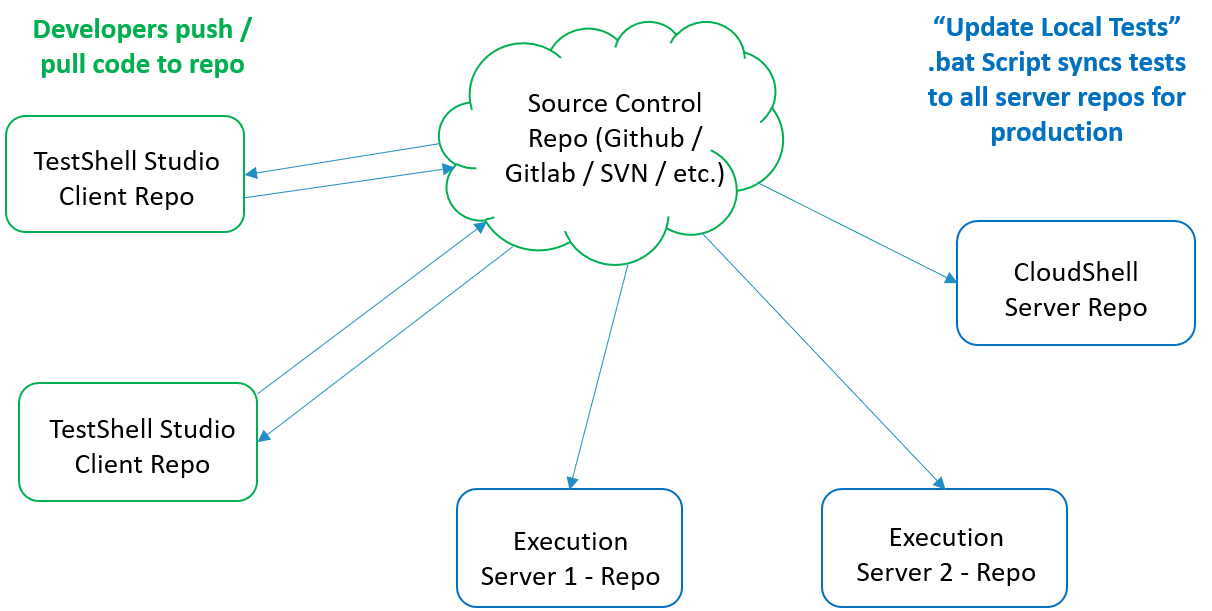 As illustrated below, in a source controlled deployment, the TestShell Studio Clients push test updates and additions to the source control server, which synchronizes the Execution Servers and Quali Server with the latest updates, allowing you to use the latest test versions when running your tests and automation suites.