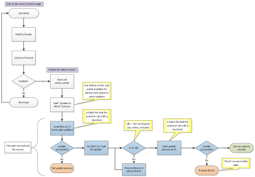 • For each execution server, if the execution server state is idle (not running any test), the execution server launches a batch file that pulls the latest test versions to the execution server. If the execution server is not idle, the batch file will run when it completes its current executions.