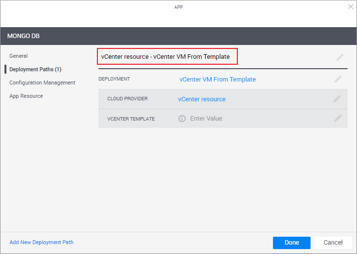 Note the deployment path's name (highlighted in the image below). The path's name is dynamic and consists of the selected Cloud Provider resource and Deployment type. You can change the name of the path by clicking the field.