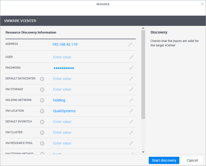 Enter the required information. Unless specified differently, paths are relative to the datacenter so for example, to specify VM storage "datastore cluster" that is under datacenter "QualiSB", enter "datastore cluster" in the VM Storage field. For guidance on finding each element in your vCenter server, see vCenter cheetsheet for versions 5.5-6.5 or vCenter cheetsheet for version 6.7 and above.