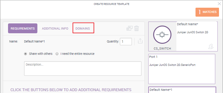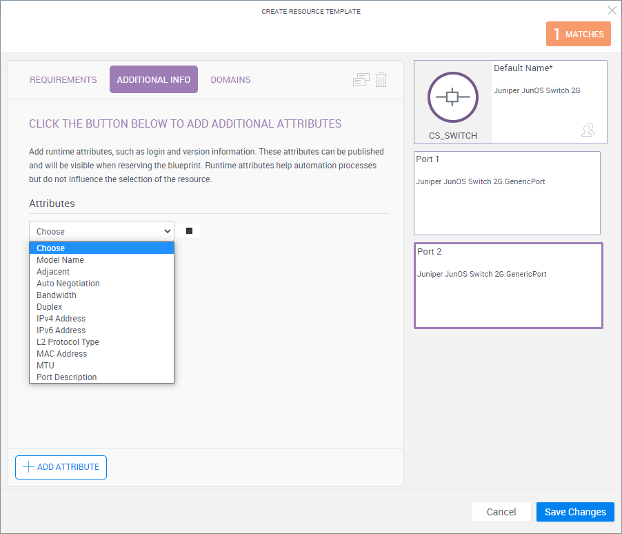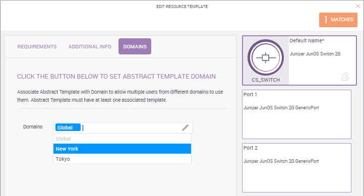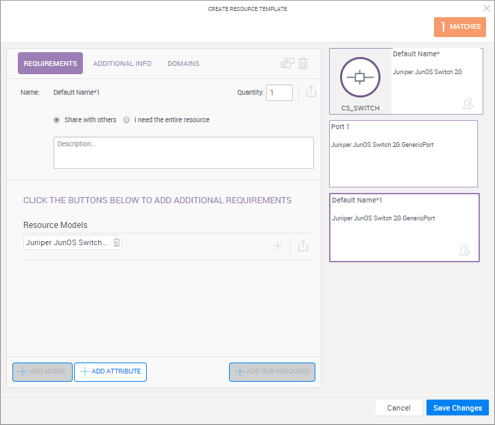 Notice the number of matches counter at the top right side of the dialog. As you modify the restrictions and structure of the abstract resource, it continually updates to provide feedback on the number of different root resources that match all the requirements in the abstract. For example, if the abstract requirements are for 1 root resource with 2 ports and you have 1 inventory resource that has 10 ports and several resources with 1 port each, the matching number will be "1".