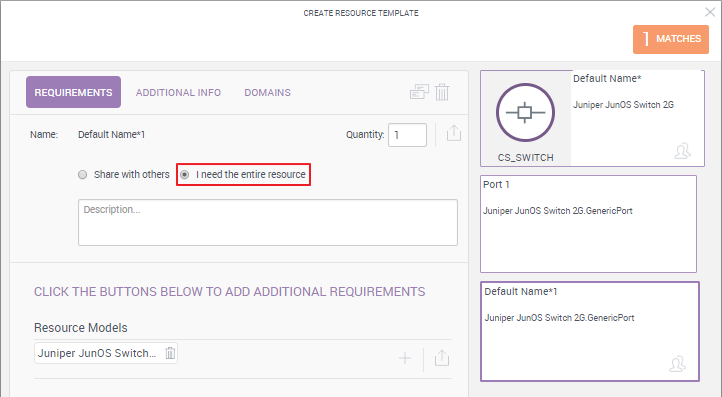 Beyond the model, attribute, and quantity requirements, which are used to select the right resources when the user reserves the blueprint, additional information can be added to the resource. This additional information will later be available to the provisioning process or to the user in the sandbox itself. One example would be saving the resource's firmware version, which needs to be upgraded as part of the sandbox provisioning process, or referencing the image file location of the resource. The Additional Info section provides a placeholder where such information can be stored.