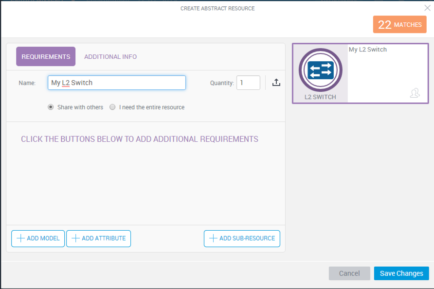 Abstract resources enable you to control how restrictive or relaxed the match conditions are. It is possible to scope an abstract resource to candidates of a particular family, a particular family and model, a group of possible models, as well as add attribute and quantity restrictions. All this is possible to set both at the resource and sub-resource level. If that sounds complicated, bear in mind that you can make the abstract resource as simple or complex as you wish it. The abstract requirements can express something as simple as a "router with three 10 GB ports" or something drastically more complicated with multiple model and attribute restrictions on each level of the resource structure.