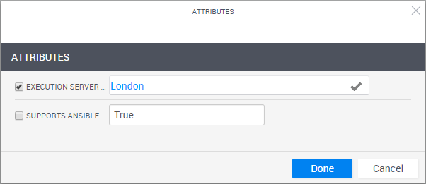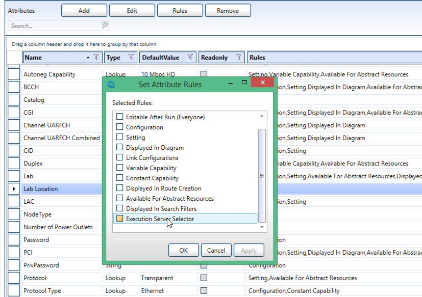 - In some scenarios, you may want to specify additional criteria for execution server selection. For example, an execution server in India that is running on a Windows OS. To achieve this, make sure the resource has these two selector attributes (for example, 'Lab Location' and 'OS'), with 'India' and 'Windows' as their values and at least one execution server with these two attributes selected and with the same values.
