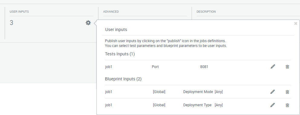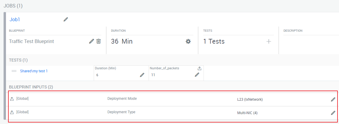 If the job is associated to a blueprint that has inputs (global/requirement/additional info), those inputs are displayed under the job. You can do the following: