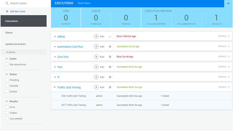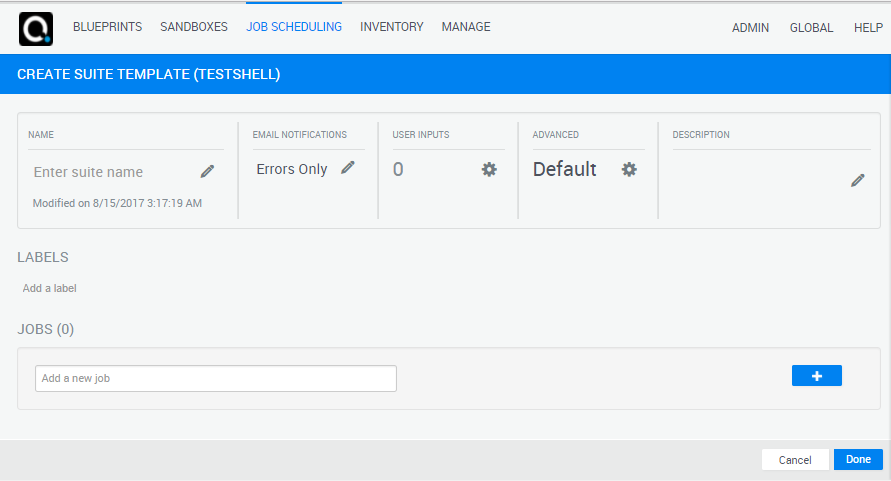 An automation suite must have at least one job. You can select the blueprint on which the job's tests will run and also a specific execution server to execute the job's tests. An automation suite's jobs run in parallel.