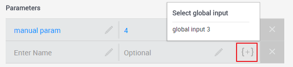 If the blueprint has global inputs, you can also set the parameter to receive the value that the sandbox end-user specifies for a global input when reserving a sandbox containing the App. To do this, enter a meaningful name for the parameter, click the parameter's "{+}" button and select the global input. The global input is displayed in the parameter's value, surrounded by curly brackets "{}". In the image below, the App's blueprint has a global input called "global input 3":