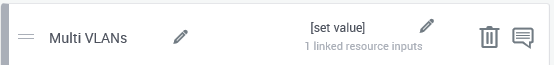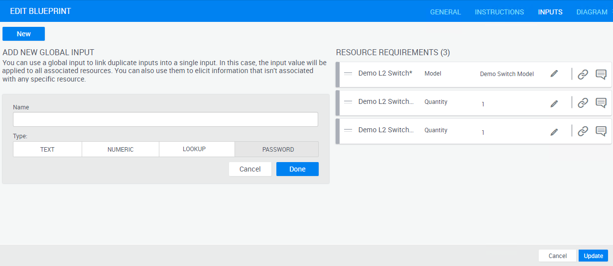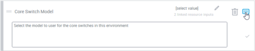 As the blueprint accumulates more required user inputs, it may become necessary to group some of them together into a single entry. One example would be if there are numerous switches in the blueprint, which all have their model set as an input. In some scenarios, the blueprint designer might want the user to feed in just one value 'Switch model' and have that value affect all relevant resources. To do so, use the 'Link inputs' icon displayed next to each resource requirement or information input.