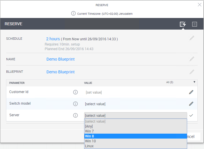 Global inputs are a simple way to request information from the user when they reserve the blueprint. You can create a global input of one of three types: Text, Numeric, Lookup or Password. It is possible to type a comma separated list. In that case, the user will get a dropdown list and will only be able to choose one of the possible values.