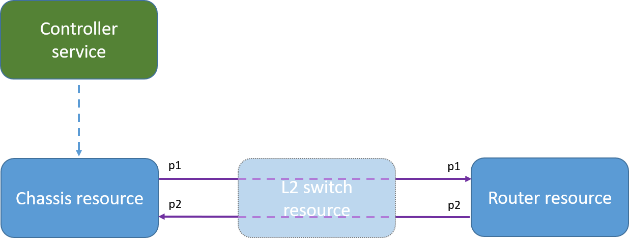 The following image illustrates a controller service that runs traffic from a traffic generator chassis to a router, via a layer 2 switch: