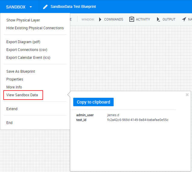 In CloudShell Portal, in the sandbox workspace, from the Sandbox menu, select View Sandbox Data.