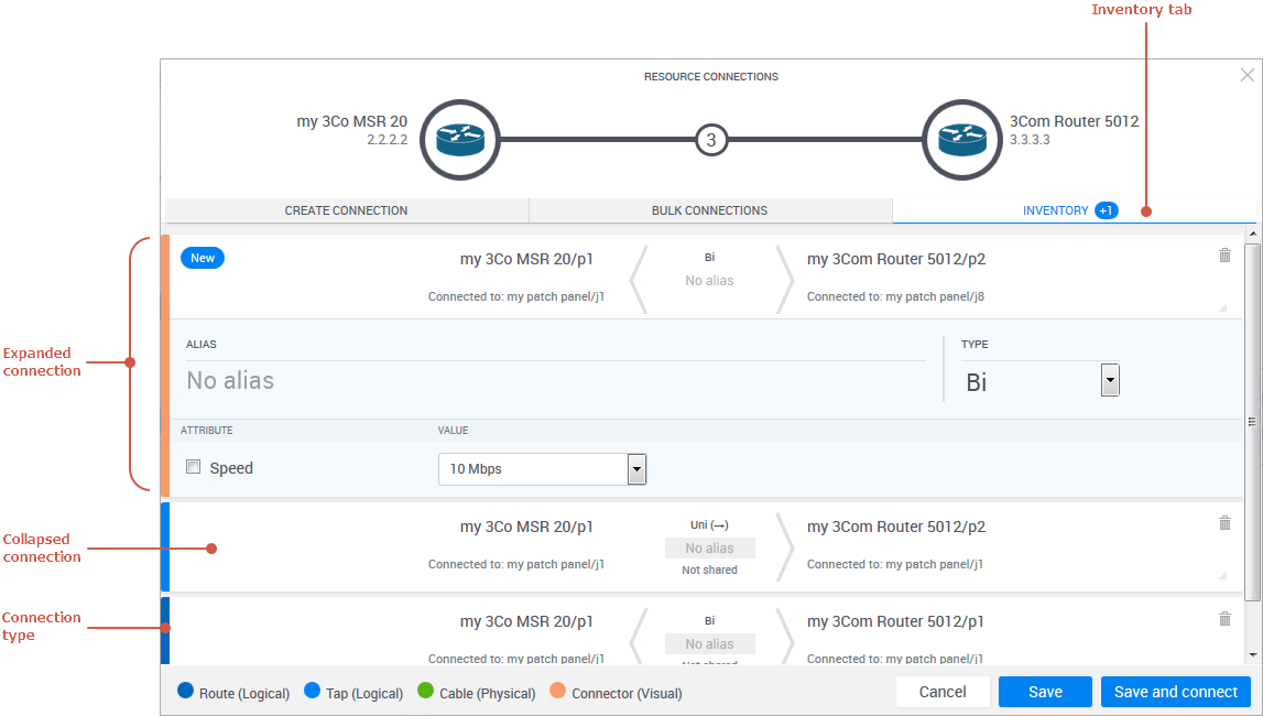 This article explains how to view the details of existing connections between resources in the diagram in the Inventory tab of the Resource Connections dialog box.
