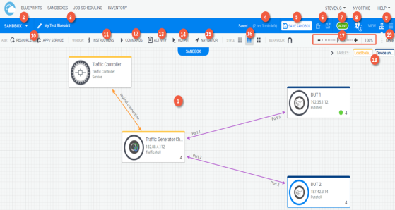 The Sandbox menu enables you to end, update and extend the sandbox, show the physical layer and save the sandbox as a blueprint. The name of the sandbox. Click to change. Saves an Active or Active (with Error) sandbox if you have a license for the Save and Restore paid add-on. See Save a Sandbox for more information. End sandbox / Extend sandbox buttons. Sandbox status Displays all the sandbox workspace tools and options in a pane. See the image below. Use these buttons to change the size of the icons in the workspace. Opens the Output console, which displays detailed information related to running blueprint and resource commands. Review the instructions of the sandbox. This option is available only if the sandbox has instructions. Click the Resource, App / Service, or Abstract button to add the suitable resource to your sandbox. The canvas displays the different resources, services and Apps in the sandbox, and their connectivity. Here you can perform different actions on the sandbox and its elements like connecting/disconnecting routes, running orchestration and resource commands and deploying Apps. Opens the Activity Feed pane, displaying information about actions and commands performed in the sandbox. Review and execute the sandbox commands. CloudShell's blueprint template includes preconfigured setup and teardown commands. Show the diagram in a mini-map on the workspace. You can drag the map to change the view in the workspace. Time left indicator. The workspace view mode. Diagram view provides a graphical representation of the sandbox. List view displays the sandbox elements in a list. Displays labels that are currently being used in the diagram. Zoom options. See who else is viewing the sandbox.