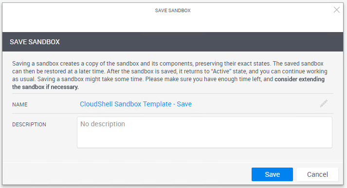 - CloudShell also has a Save As Blueprint option. However, unlike Save As Sandbox, it only saves the diagram and properties of the sandbox but not the state of the sandbox and the sandbox's components. For additional information, see Save a Sandbox as a Blueprint.