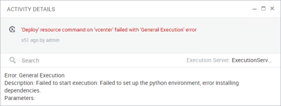The Activity Details window provides logging information about execution errors for a specific blueprint or resource command in the sandbox. This information includes the error message, the execution server that ran the command, and a detailed description of the error.