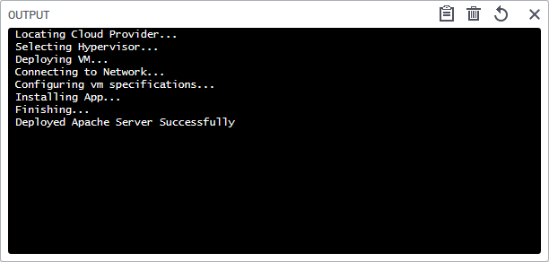 The Output console displays information related to blueprint and resource commands that are running in the sandbox. The last 10 output messages are displayed in the console. By default, the console window opens whenever a new sandbox event occurs, but the admin can change this behavior using the AutoOpenCommandOutputOnNewEvents configuration key.