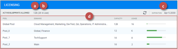 In the Licensing page, the system administrator can monitor the current usage in each pool – how many concurrent sandboxes are in use in each pool.