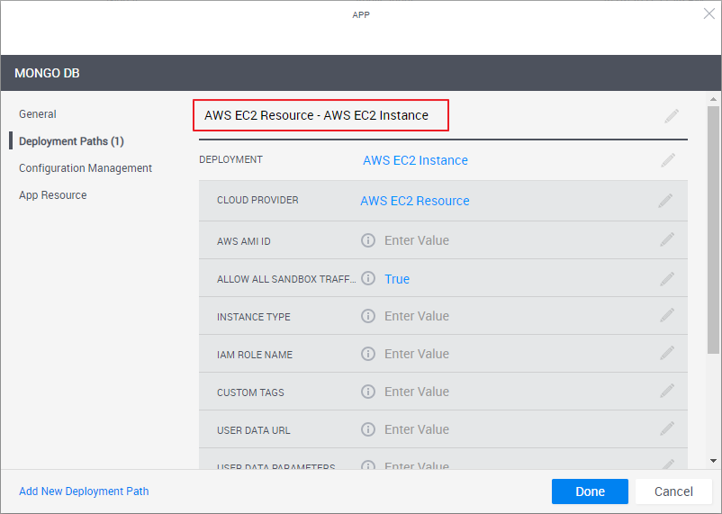 Note the deployment path's name (highlighted in the image below). The path's name is dynamic and consists of the selected Cloud Provider resource and Deployment type. You can change the name of the path by clicking the field.