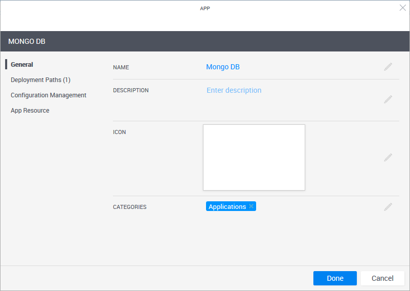 Field Required Description Name Required App name that is displayed in the catalog. Description Optional Description of the App. Icon Optional Add an image to the catalog definition. The recommended size for the image is 190x120 pixels (image size is limited to 400x400 pixels or 200 KB). Categories Optional Service categories are a method to classify Apps. The Apps are displayed in the Add App / Service side pane in the blueprint and sandbox diagram, arranged in categories. Only users who are permitted to view the category can access the App. Apps without a category are not displayed.