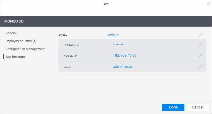 In the left pane, click App Resource to optionally set the VM's operating system user credentials (for example, to connect to the VM via RDP or SSH). You can also change the deployed App's Shell.