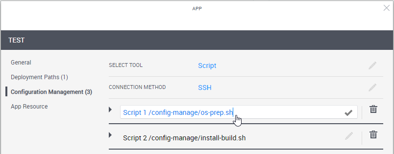 - Optionally click the Add New Script/Playbook link at the bottom right to add additional custom scripts/Ansible playbooks to the App. The scripts will run in their display order, from top to bottom. You can drag scripts up or down to rearrange.