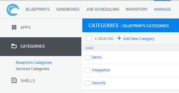 2. Select the desired category type, either Blueprints Categories or Services Categories.