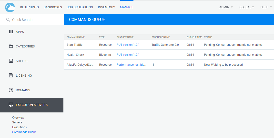 The Commands Queue page lists the command executions that are currently in the queue. In addition, it displays the reason why each command is in the queue. This applies to all types of commands in CloudShell, including resource/App/service commands coming from the shell's driver and orchestration commands. For details on developing such commands, see Driver Deep Dive and Script Deep Dive.