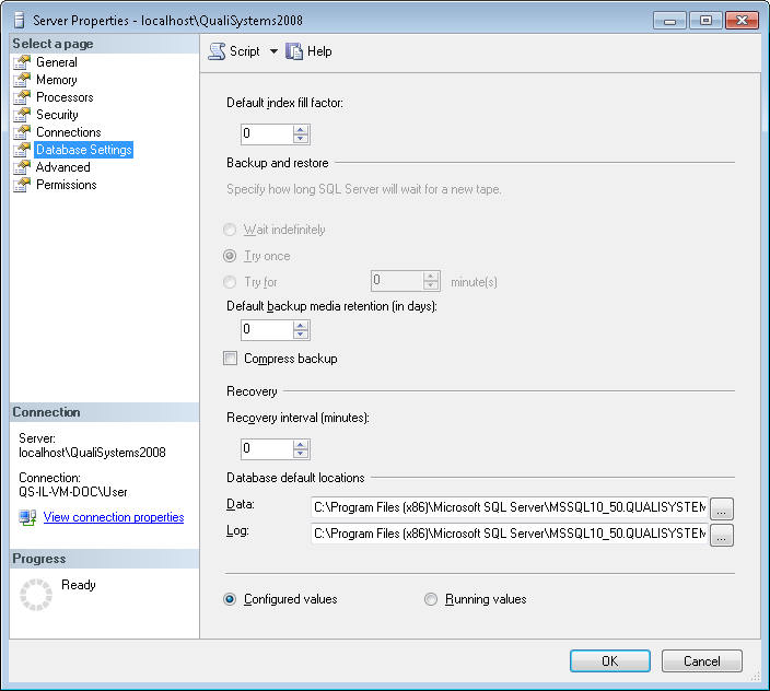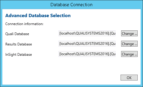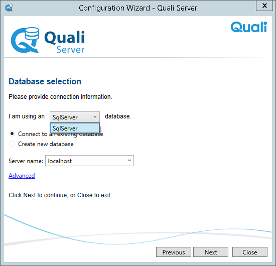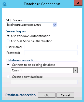 If you chose to install SQL Express 2016 SP1, in the Server Name dropdown list, verify that localhost\QUALISYSTEMS2016 is displayed: