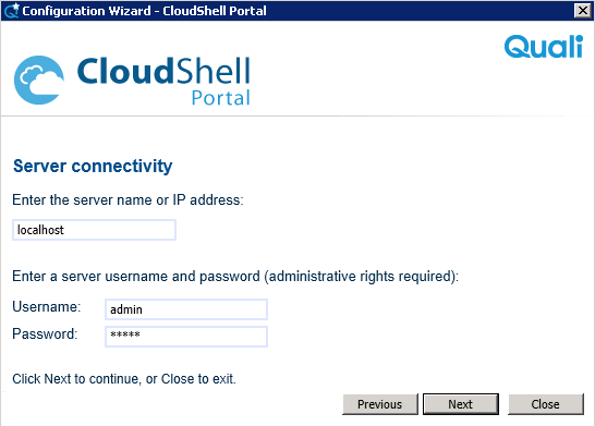Enter the name or IP of the computer where Quali Server is installed. If the server is installed locally, use localhost as the server name.
