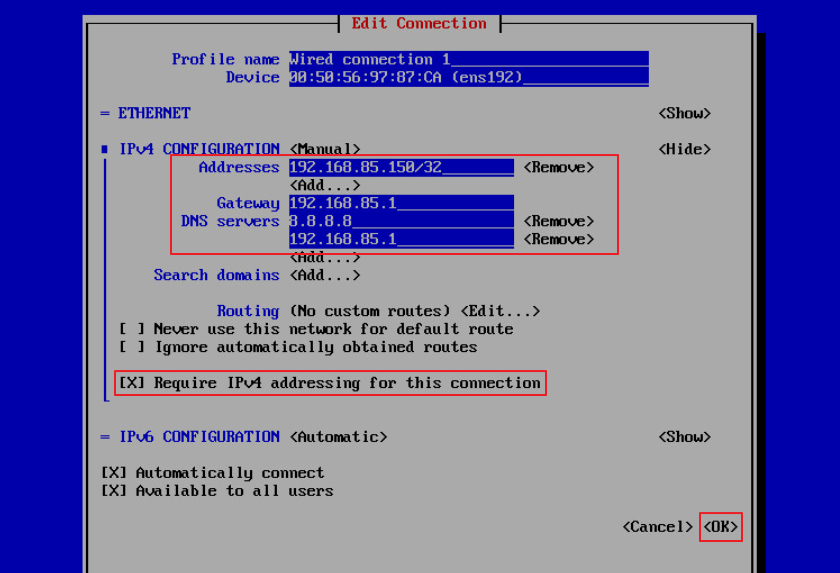 6. In the IPv4 CONFIGURATION area, set the static IP address, gateway and DNS server, select the Require IPv4 addressing for this connection checkbox, and click OK.