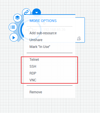 In the blueprint's diagram, hover over the resource. In the Actions menu, the options you configured are displayed: Telnet, SSH, RDP, and VNC. Each option redirects you to the IP address you specified in the resource.