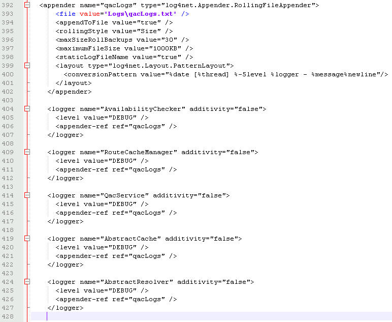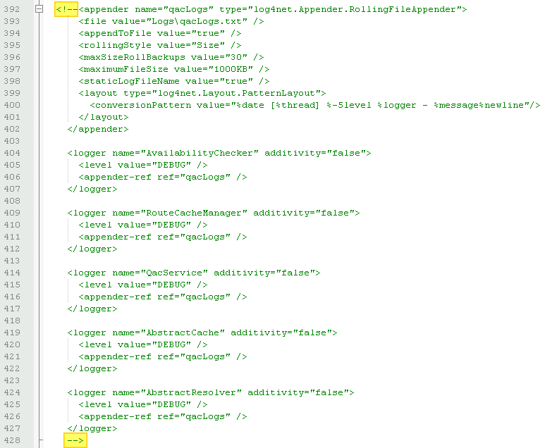 Remove <-- and --> at the beginning and end of the qacLogs section: